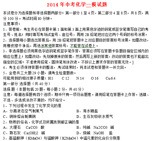 山西农业大学附属中学2014年化学中考模拟题附答案(新人教版)