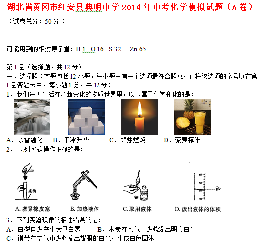 湖北黄冈红安典明中学2014年化学中考模拟题附答案
