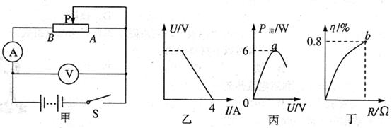 点时滑动变阻器的功率段大:图丁表示铅蓄电池输出电能的效率η与变阻器接入电路电阻大小的关系,b点时η最大。不计电表、导线对电路的影响,求: