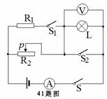 41.解:(1)S、S1、S2都闭合,滑动变阻器滑片移到最右端时,R1与R2并联(或等效电路如下图1), ………………………………………………………(1分)