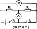 27.如图所示的电路中,S1闭合S2断开时,甲、乙是电流表,I甲:I乙=1:3,此时电路的总功率为P1;当S1、S2都闭合时,甲、乙是电压表,此时电路的总功率为P2,则下列说法正确的是( )