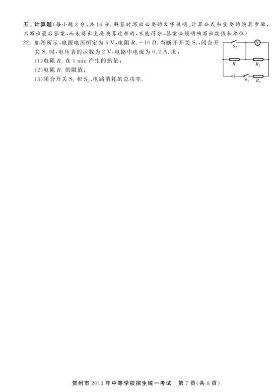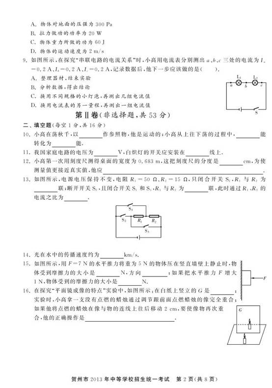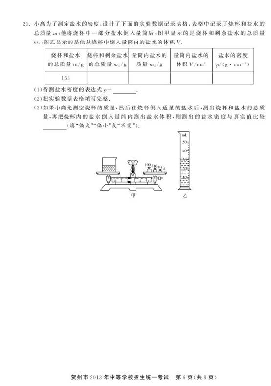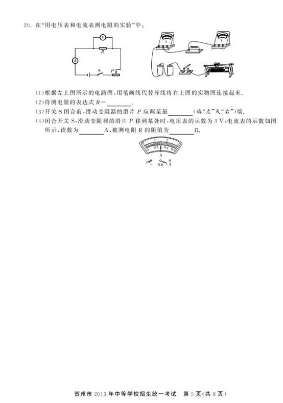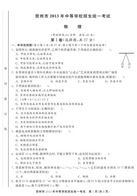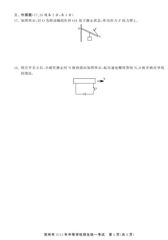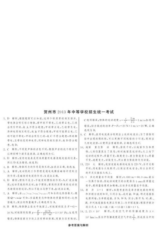 2013年广西贺州市中考物理真题试卷附答案(扫描版)