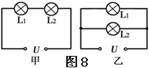 13.如图8所示,将灯L1、L2按甲、乙两种方式接在电压均为U的两个电路中。L1在甲、乙两个电路中的电功率分别为4W和9W,设两灯丝的电阻不变。下列说法中正确的是( )