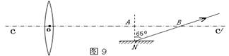 14.(6分)如图9所示,一条平行于凸透镜主光轴CC/的入射光线经透镜折射后入射于平面镜上的N点(平面镜与主光轴平行),经平面镜反射后与主光轴CC/相交于B点,过N点作平面镜的法线与主光轴CC/相交于A点,O点为凸透镜的光心。