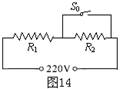 19. 如图14所示,是某种电热饮水机的简化电路示意图。它有加热和保温两种工作状态(由机内温控开关S0自动控制),阅读该饮水机说明书可知:热水箱容积2L,额定电压220V,加热时的功率400W,保温时的功率40W。求:试问: