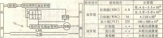 45.(5分)左下图是人体部分生理活动示意图,右下表是张大爷最近去医院检查的部分结果(“++”代表检出该成分“一”表示未检出或微量),请据图、表回答下列问题