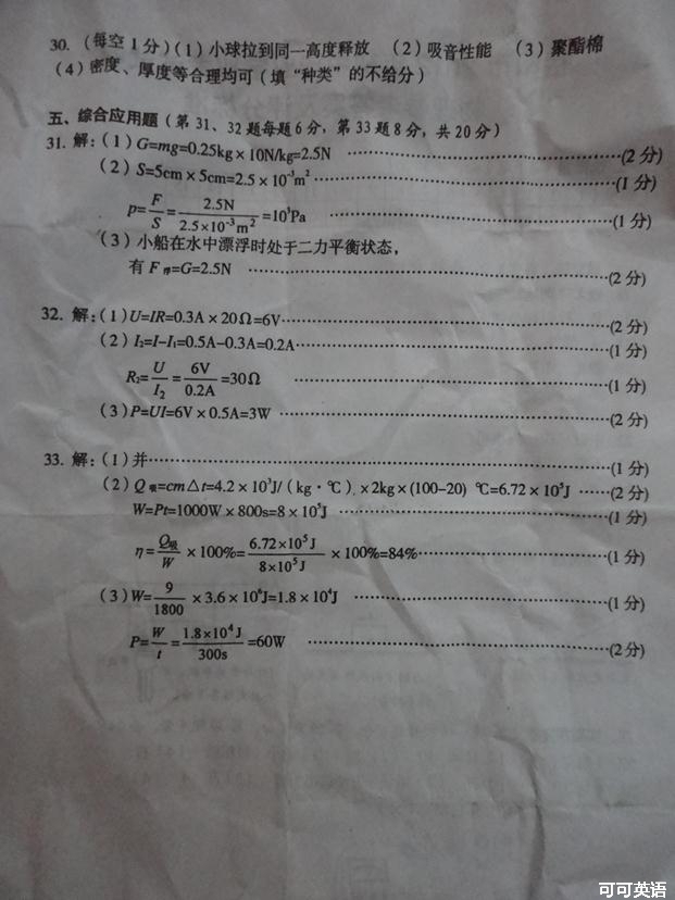 30.(4分)随着生活水平的日益提高,不少场所的装修会考虑声学吸音效果。小明同学想比较几种常见装修材料的吸音性能,他找来厚度相同的四种小块材料(聚酯棉、软木、泡沫和海绵),进行了图示实验:桌面上放一个玻璃杯,在玻璃杯下分别放上待测试的小块材料,将悬挂在细线下的小球拉到同一高度释放去敲击玻璃杯,仔细比较玻璃杯发出的声音大小。