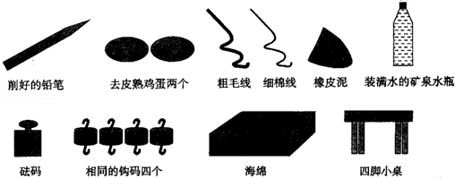 实例 去皮熟鸡蛋两个、细棉线、粗毛线、相同的钩码四个 在细棉线和粗毛线的两端各挂一个钩码,将两条线各压在一个鸡蛋上 用细棉线压鸡蛋时,切入的更深一些