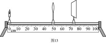 31.小彤在探究凸透镜成像规律的实验中,将焦距为10cm的凸透镜固定在光具座上50cm刻线处,将光屏和点燃的蜡烛分别放在凸透镜的两侧,如图13所示,为了找到烛焰清晰的像,小彤应将光屏向 移动(选填“左”或“右”)。小彤将光屏移到某一位位置时,光屏上呈现烛焰清晰的像,则该像是 像(选填“实”或“虚”)。小彤将点燃的蜡烛移动到光具座上35cm刻线处,移动光屏可以再次在光屏上观察到的烛焰清晰的像,这一实验现象可以说明 的成像特点(选填“照相机”,“幻灯机”或“放大镜”)。