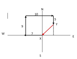 1. A bird flew from point X, 向西7米,向北9米,向东10米,向南5米到达Y处,求x与y的直线距离
