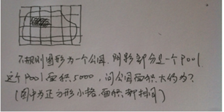 5. V1 不规则图形为一个公园,阴影部分是一个POOL,面积为5000,问公园面积大约多少?(图中正方形小格面积都相同)