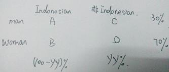 V2:说好像是参加个什么东西 woman占人数的40% 会印度尼西亚语言的占人数的10% 问会印度尼西亚语言的woman比例