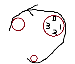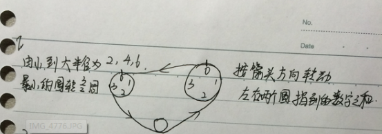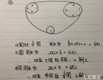 13. V1. PS 齿轮转动 (两个齿轮数字一样)左上半径4π右上半径6π下面那个小的半径2π,问下面那个小的转过一圈半之后齿轮下面(directly under)的数字之和是几?