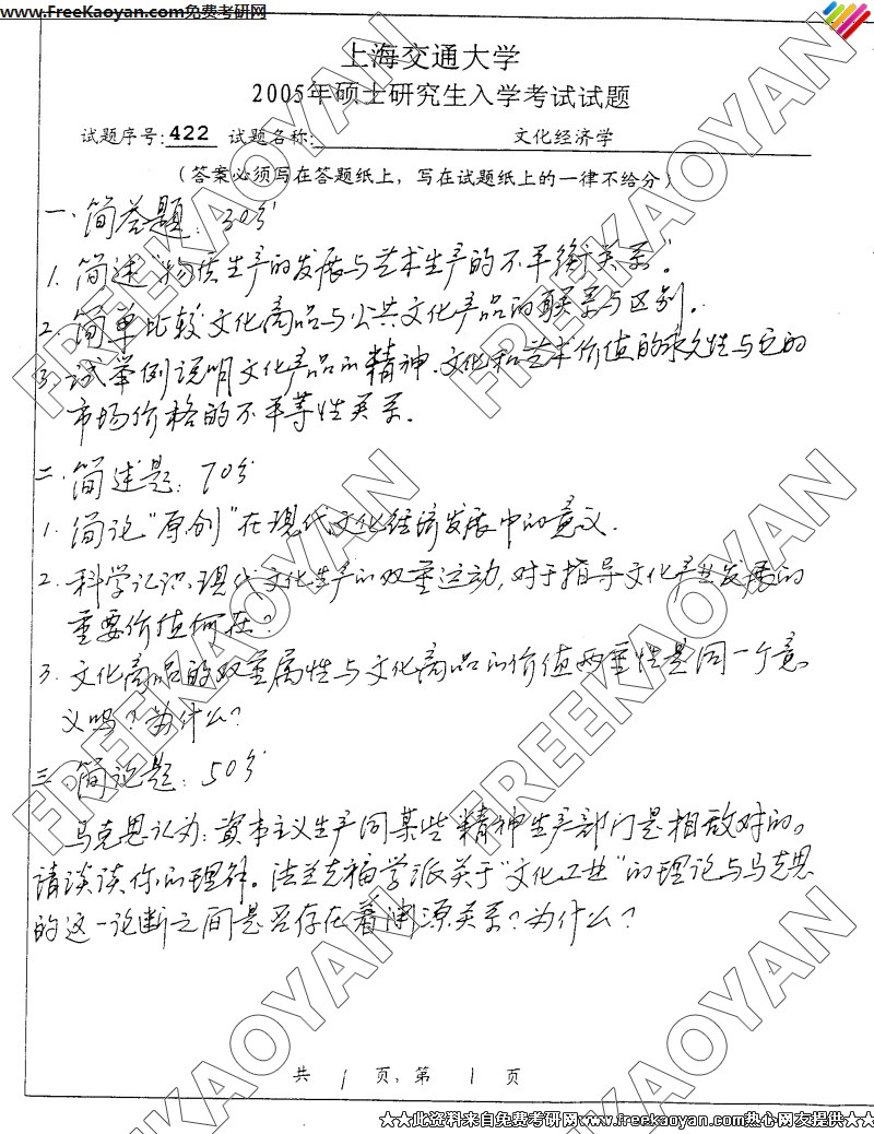 上海交通大学2005年文化经济学专业课考研真题试卷