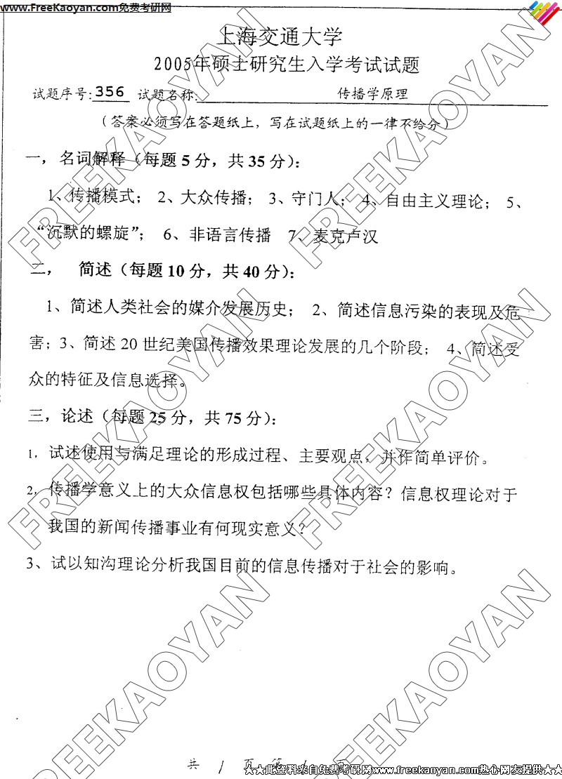 上海交通大学2005年传播学原理专业课考研真题试卷